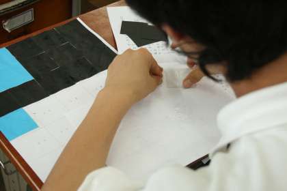伏見中学校では,夏休み前に学校祭【伏中祭】のテーマを決め,そのテーマにのっとったシンボルマークも決めます。夏休み中に生徒会本部役員の生徒がそのシンボルマークを校舎壁面一杯になるように拡大作業の下準備を行います。そして,全校生徒一人一人が作成したものをつなぎ合わせ大壁画を作成します。伏中祭の実施日にあわせて校舎の壁面に吊り下げます。