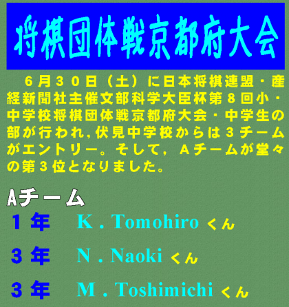 6月30日(土)に日本将棋連盟・産経新聞社主催文部科学大臣杯第8回小・中学校将棋団体戦京都府大会・中学生の部が行われ,伏見中学校からは3チ−ムがエントリー。そして,Aチームが堂々の第3位となりました。