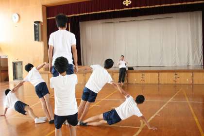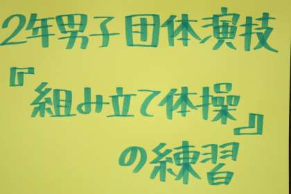 10月1日(木)に行われる体育大会で2年生男子は『組み立て体操』を団体演技で行います。その練習では,お互いに声をかけあいながら協力しあって頑張っています。体育大会当日は2年生男子106名の息の合った組み立て体操が披露できそうです!ガンバレ2年生男子生徒諸君!