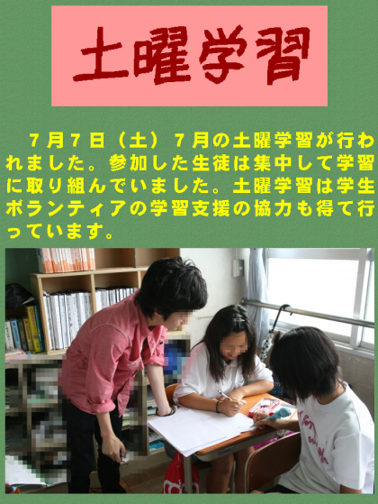 7月7日(土)7月の土曜学習が行われました。参加した生徒は集中して学習に取り組んでいました。土曜学習は学生ボランティアの学習支援の協力も得て行っています。