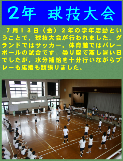 7月13日(金)2年の学年活動ということで,球技大会が行われました。グランドではサッカー。体育館ではバレーボールの試合です。曇り空で蒸し暑い日でしたが,水分補給を十分行いながらプレーも応援も頑張りました。