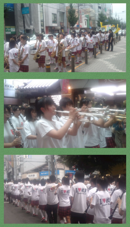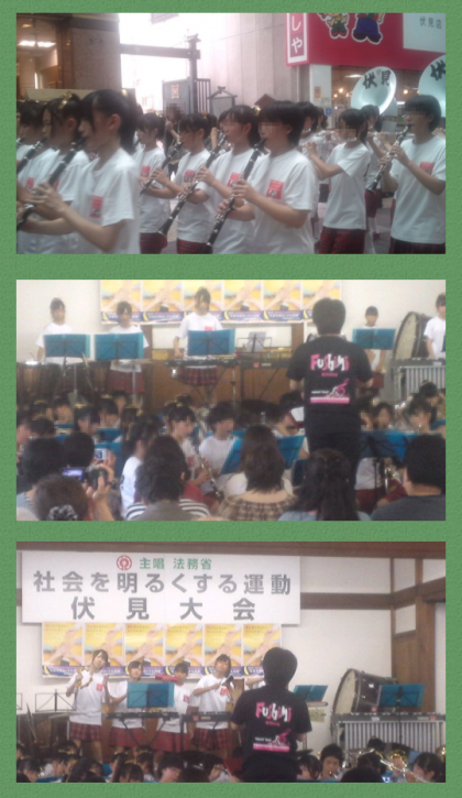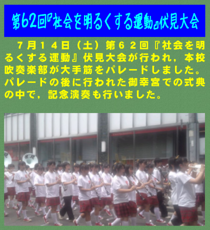 7月14日(土)第62回『社会を明るくする運動』伏見大会が行われ,本校吹奏楽部が大手筋をパレードしました。パレードの後に行われた御幸宮での式典の中で,記念演奏も行いました。