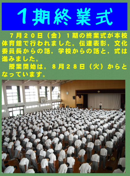 7月20日(金)1期の終業式が本講体育館で行われました。伝達表彰,文化委員長からの話,学校からの話と,式は進みました。授業開始は,8月28日(火)からとなっています。
