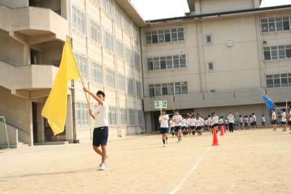 色別の団長が団旗を持っての入場行進の練習や団体演技の練習を行いました