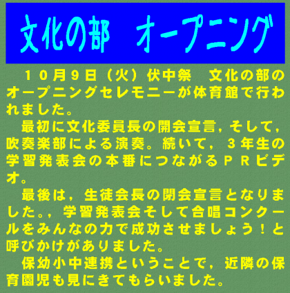 10月9日(火)伏中祭 文化の部のオープニングセレモニーが体育館で行われました。最初に文化委員長の開会宣言,そして,吹奏楽部による演奏。続いて,3年生の学習発表会の本番につながるPRビデオ。最後は,生徒会長の閉会宣言となりました。,学習発表会そして合唱コンクールをみんなの力で成功させましょう!と呼びかけがありました。保幼小中連携ということで,近隣の保育園児も見にきてもらいました。