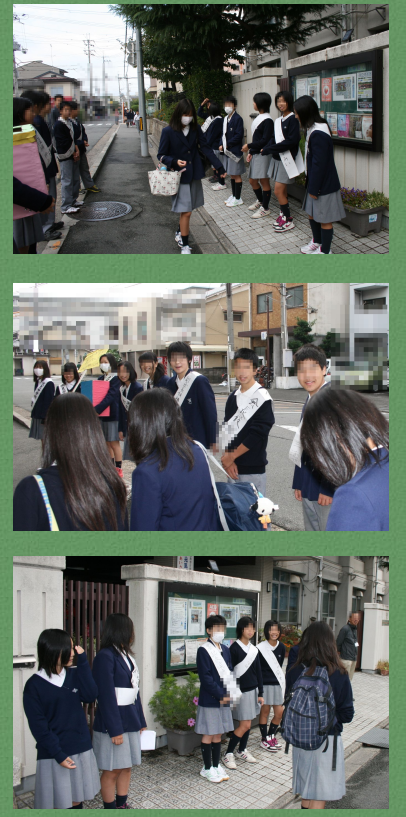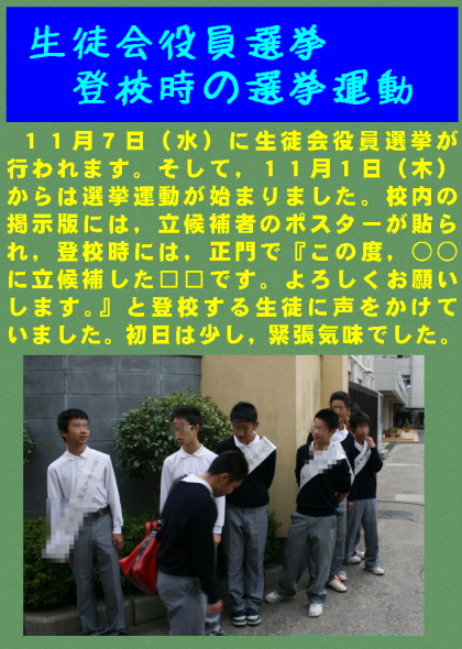 11月7日(水)に生徒会役員選挙が行われます。そして,11月1日(木)からは選挙運動が始まりました。校内の掲示版には,立候補者のポスターが貼られ,登校時には,正門で『この度,○○に立候補した□□です。よろしくお願いします。』と登校する生徒に声をかけていました。初日は少し,緊張気味でした。