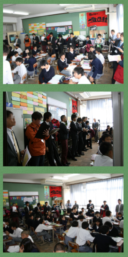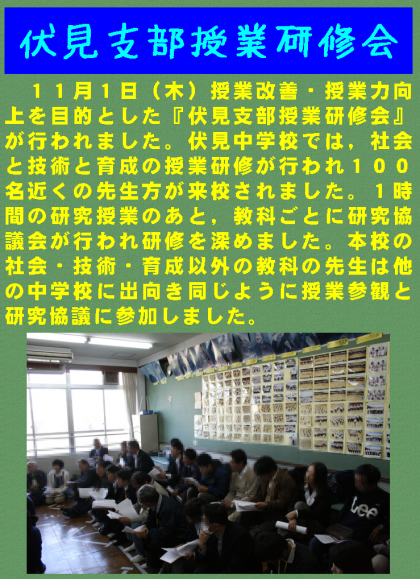 11月1日(木)授業改善・授業力向上を目的とした『伏見支部授業研修会』が行われました。伏見中学校では,社会と技術と育成の授業研修が行われ100名近くの先生方が来校されました。1時間の研究授業のあと,教科ごとに研究協議会が行われ研修を深めました。本校の社会・技術・育成以外の教科の先生は他の中学校に出向き同じように授業参観と研究協議に参加しました。