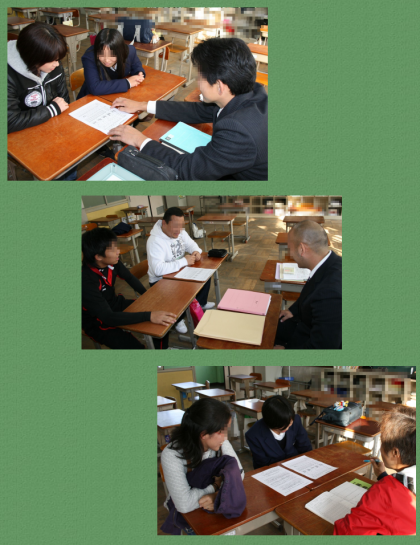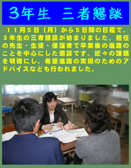 11月5日(月)から5日間の日程で,3年生の三者懇談が始まりました。担任の先生・生徒・保護者で卒業後の進路のことを中心にした懇談です。近々の課題を明確にし,希望進路の実現のためのアドバイスなども行われました。