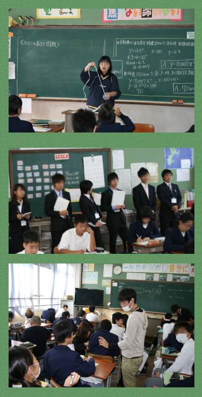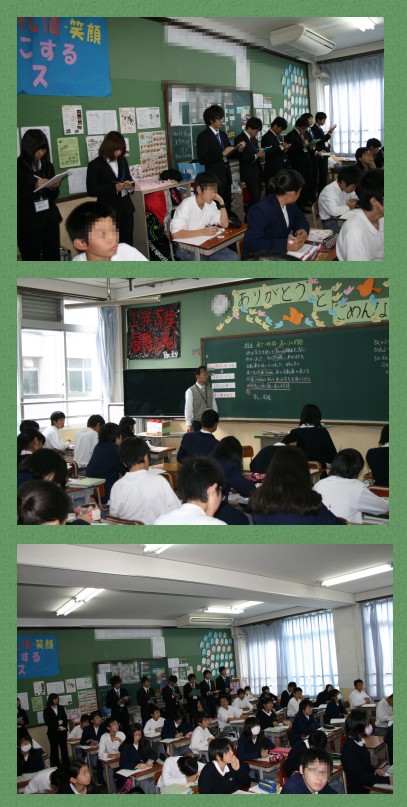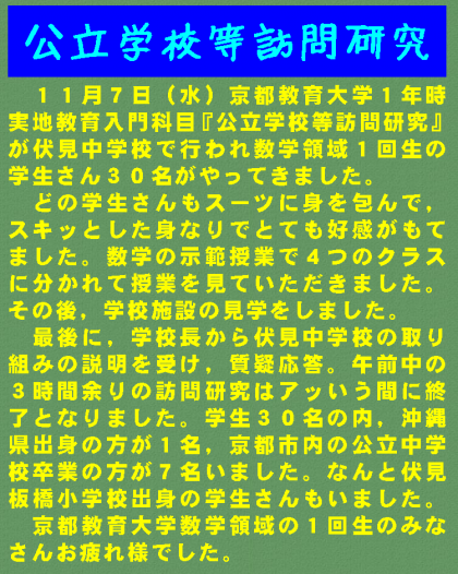 11月7日(水)京都教育大学1年時実地教育入門科目『公立学校等訪問研究』が伏見中学校で行われ数学領域1回生の学生さん30名がやってきました。どの学生さんもスーツに身を包んで,スキッとした身なりでとても好感がもてました。数学の示範授業で4つのクラスに分かれて授業を見ていただきました。その後,学校施設の見学をしました。最後に,学校長から伏見中学校の取り組みの説明を受け,質疑応答。午前中の3時間余りの訪問研究はアッいう間に終了となりました。学生30名の内,沖縄県出身の方が1名,京都市内の公立中学校卒業の方が7名いました。なんと伏見板橋小学校出身の学生さんもいました。京都教育大学数学領域の1回生のみなさんお疲れ様でした。