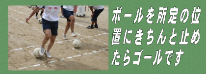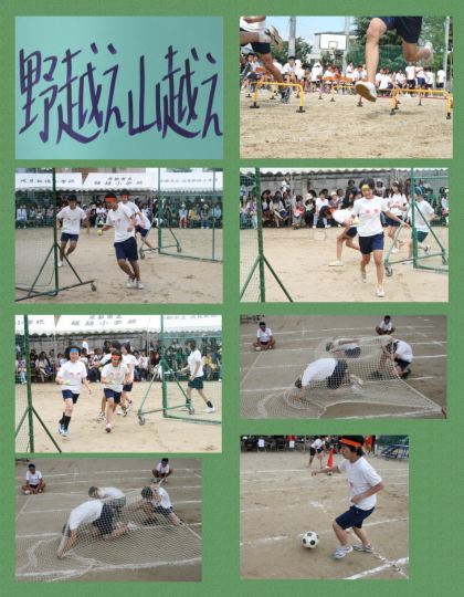 伏中名物 障害物走!その名も『野越え 山越え』。スタートしてすぐに,ミニハードルを飛び越えます。次は,バドミントンのラケットにテニスボールを乗せて,防球ネットをジグザグに進みます。そして,ネットくぐり,最後は,ボールを蹴って止めてゴールです。ゆっくり蹴ってボールを止めなくてはいけません!