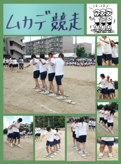 レクレーション種目の1つである『ムカデ競争』男子2人女子2人の4人1組でムカデを作ります。並び方はグループの自由。息の合っているチームはどんどん進みますが,最初の一歩の出ないチームも!男女仲良く楽しそうに競技をしていました。