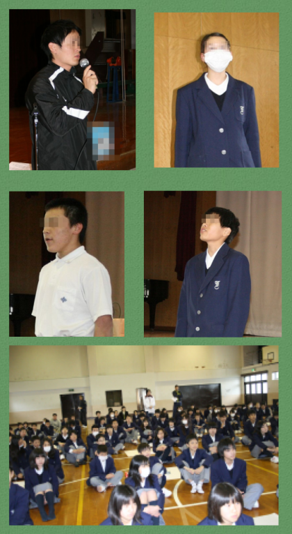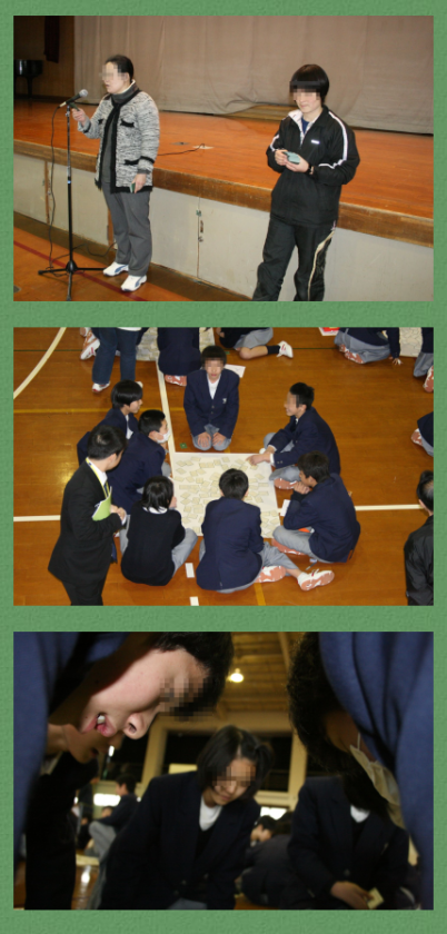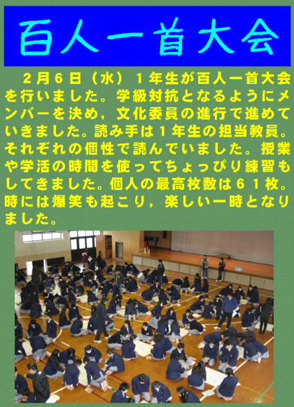 2月6日(水)1年生が百人一首大会を行いました。学級対抗となるようにメンバーを決め,文化委員の進行で進めていきました。読み手は1年生の担当教員。それぞれの個性で読んでいました。授業や学活の時間を使ってちょっぴり練習もしてきました。個人の最高枚数は61枚。時には爆笑も起こり,楽しい一時となりました。
