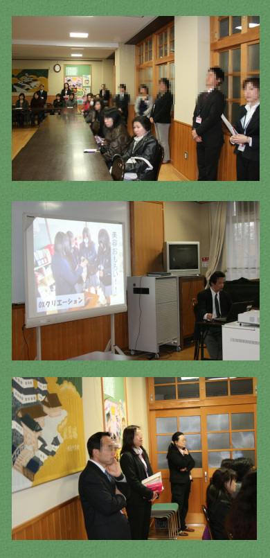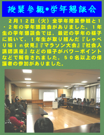2月12日(火)全学年授業参観と1・2年の学年懇談会がありました。1年生の学年懇談会では,最近の学年の様子に続いて,1年生が取り組んだ『しゃべり場in伏見』『マラソン大会』『社会人講師講座』などの様子がパワーポイントなどで報告されました。50名以上の保護者の参加がありました。
