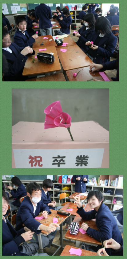 2月20日(水)3年生が卒業式当日にブレザーに付けるコサージュを2年生が作成しました。1つ1つ心を込めて,作ります。