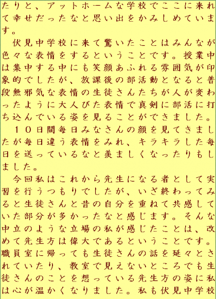 伏見中学校の先生方、そして生徒のみなさんこんにちは!先日は10日間伏見中学校の一員として学校生活を送らせて頂き本当にありがとうございました。実は私は小学校の教師を目指しています。今回は私が先生になりたいと思ったきっかけである中学校という場で実地研修をさせて頂きたいと思いここに来させていただきました。正直とても緊張していて不安に感じていましたが、先生方をはじめ伏見中学校の生徒さんはみなさんとても暖かくて廊下を歩いていても必ず誰か声をかけてくれたり、帰りに声を掛けてくれて一緒に帰ってくれたりと、アットホームな学校でここに来れて幸せだったなと思い出をかみしめています。