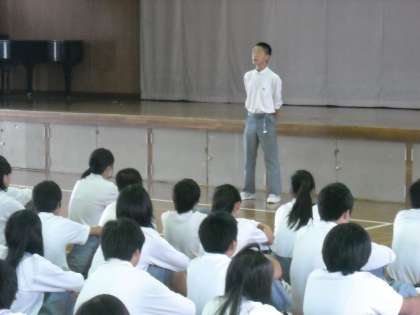 夏休み前の集会です。これまでの反省や休み後どのように改善していくのか,クラスごとに代表が発表しました。