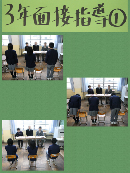 1月13日(水)放課後の時間を使って,3年生の進路指導の一環として【面接指導】がはじまりました。クラスでの練習を充分に積んだあと,校長先生や他学年の先生を面接官に見立てて,本番さながらの面接練習です。模擬面接では緊張してガチガチになる生徒も。しかし,練習を重ねるとビックリするぐらい受け答えが上手になります。