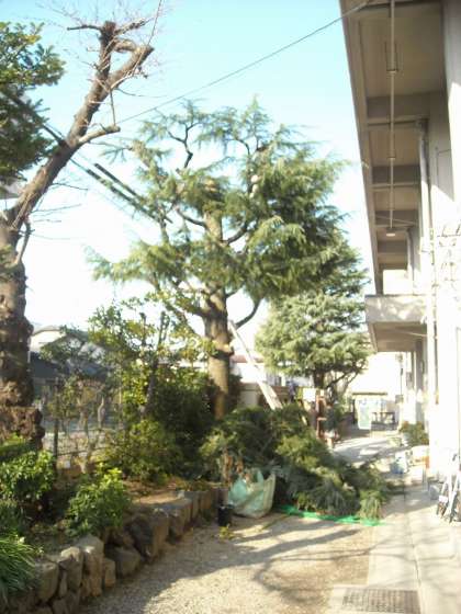 3月7日(金)本日は公立高校の中期選抜入試です。受験生の皆さん,健闘を祈ります。さて,校内では昨日より,剪定が続いています。中庭のクスの大木もすっかり綺麗になりました。