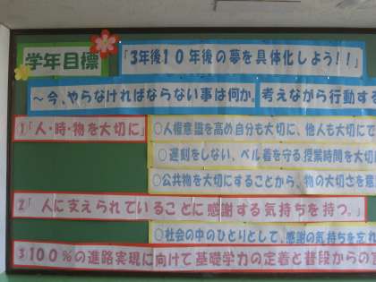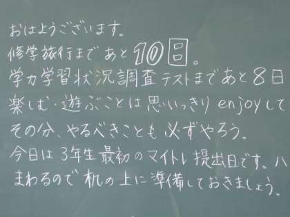 義務教育の最終年を迎えた3年生は、充実した学校生活を送っています。登校した教室の黒板には、担任からの熱いメッセージが・・・。修学旅行のみならず学習面にもしっかり目的をもって臨むよう意識づけが書かれていました。また、廊下には新たに学年目標が掲示され、学校を引っ張る最高学年としてこの1年のスタートを切りました。