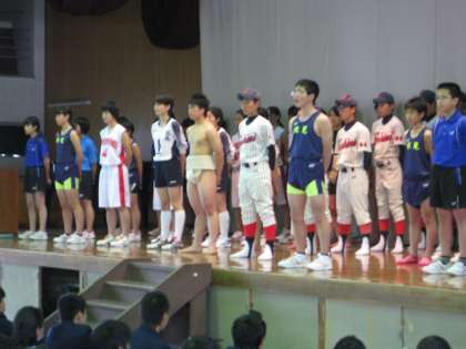4月22日(火)「春体壮行会」を行いました。全校生徒に見守られる中、クラブごとに代表生徒が入場行進を行い、運動選手らしい振る舞いに皆見とれていました。その後ステージ上で整列したのち、各主将が大会に向けての決意表明を行いました。