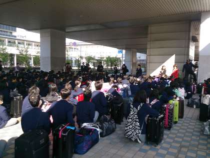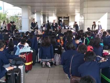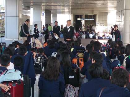 3年生の生徒を乗せたバスは、無事に伊丹空港に到着。伊丹空港の一角を借りて、結団式を行いました。