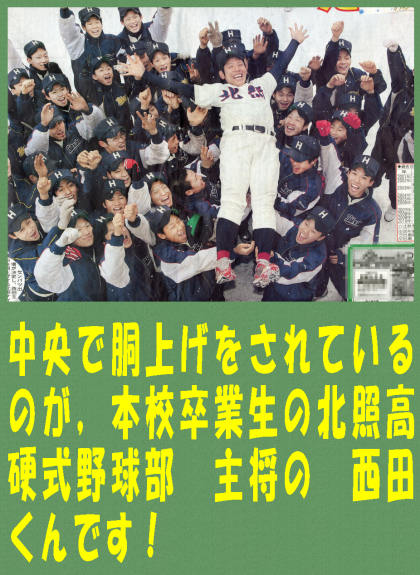 本校卒業生で,現,北照高校(北海道)2年生で硬式野球部キャプテンの西田くんが春の甲子園 選抜大会 出場を決めました。そのことが報知新聞に大きく取り上げられました。母校の中学校としても精一杯応援したいです。