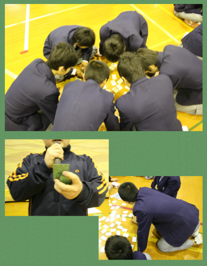 2月1日(月)6限 2年生が『百人一首大会』を行いました。各クラス対抗になるようにグループを編成し,先生たちが順番に読み手となりました。頭をつきあわせて,楽しく百人一首に興じていました。