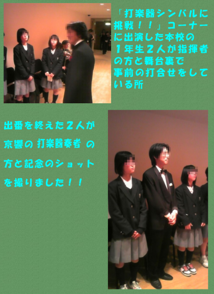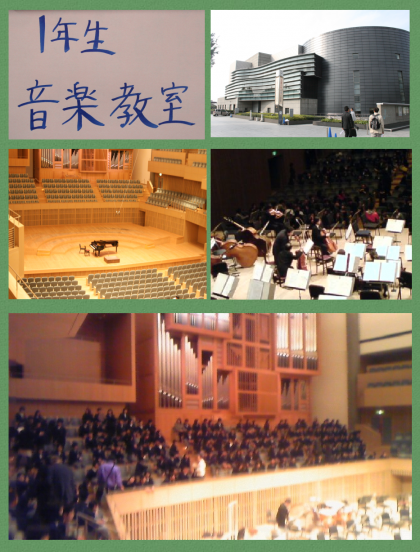 2月6日(金)1年生が京都コンサートホールで行われた『オーケストラ入門教室』に参加しました。鑑賞する座席はパイプオルガン前の指揮者の顔が見える席でした。また,このプログラムの【打楽器シンバルに挑戦!!】で本校の女子生徒2名がブラームスの名曲「ハンガリー舞曲第5番」の打楽器パートに挑戦し,見事な演奏を披露してくれました。