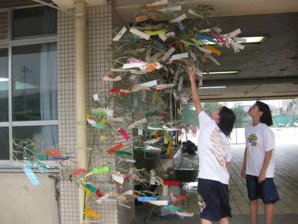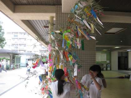 「夏の大会で優勝しますように」「希望の高校へ行けますように」など、思い思いの願いを込めた飾りが各学年ごとに合計3本、ピロティ正面に設置されています。