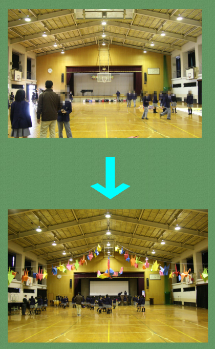 3年生を送る会の前日,体育館装飾が行われ,1年生の手により作られた大鶴が体育館一杯に飾られました。