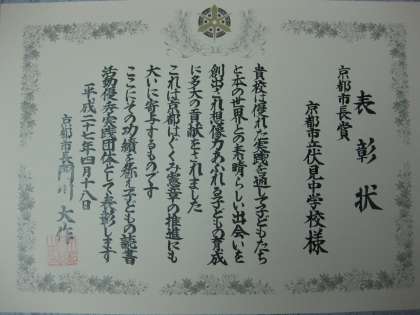 平成26年度「京都市子どもの読書活動優秀実践団体表彰」において、本校が「市長賞」を受賞しました。昨年度は、伏見中央図書館との連携が1年間を通して行われ、本校の図書室もリニューアルされたことから、伏中生の読書との関わりはより一層推進されました。本年度も今回の表彰にふさわしい図書館活動を、推進していきたいと思っています。