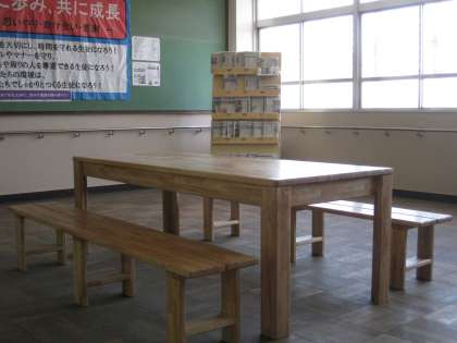 3年生校舎(廊下)に「木製テーブル」が設置されました。「学校ふれあい手作り事業」でお世話になる森田正和先生の力作です。これまで先生には、図書室の書架など様々なものを手作りしていただきましたが、今回は重厚感と温かみのある作品となりました。3年生の代表生徒が御礼と感謝の言葉を述べ、贈呈式としました。今後は、グランドに設置する「木製ベンチ」を作っていただく予定です。