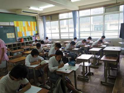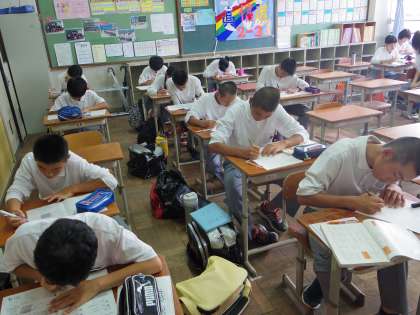 前記の通り、夏季学習会が始まり、2年生の教室にもたくさんの生徒が集まっています。