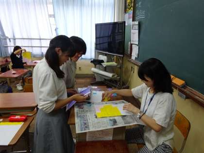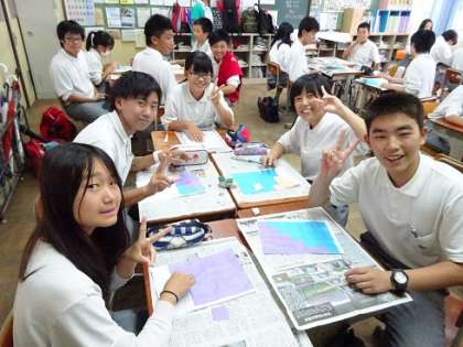 大壁画作成 3年生の様子です。3年生は手際よく作業が進んでいました。グループで紙を回したりして協力して活動していました。教育実習の先生やインターンシップの先生にも参加していただきました。