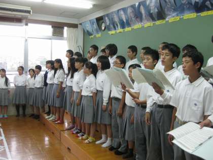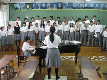 中学入学後、「合唱コンクール」を初めて経験する1年生も頑張っています。この日は輪番で音楽練習を行い、教室や廊下でのパート別練習も含め、上級生に負けじと頑張っています。本番まで約三週間。素敵なハーモニーの完成をめざして、1年生も頑張っています。