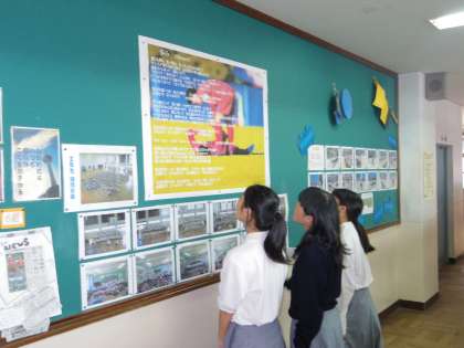 歌詞の入ったポスター前で口ずさむ生徒、歌詞カードをみて覚えている生徒、集まって歌う生徒など、まちまちのスタイルで、この歌に親しんでいっています。