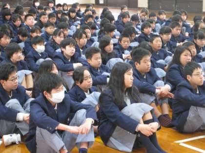 昨日入学式を終えた1年生の2日目の様子です。2限、体育館に集合した1年生は学年集会を行い、学年目標の発表や約束事の確認をした後、教科担当の発表を行いました。まだまだ緊張はほぐれないようで、笑っていいタイミングでもその反応は小さかったです。