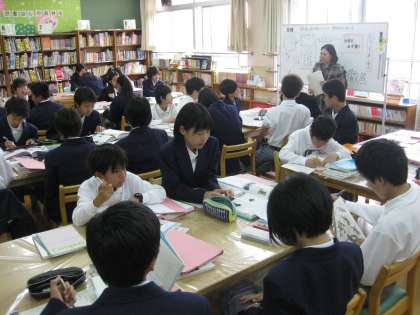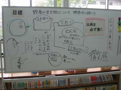 各自が野原の生き物を選び、図書を活用して徹底的に調べた後、生き物になりきった気持ちで自己紹介文を作成していました。探究的な授業スタイルは、自ら進んで学習する場面も多く、内容がしっかりと身に付いていくようです。次の時間は、教室に戻って発表を行うことで、さらに学習内容が深化されていきます。