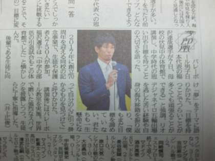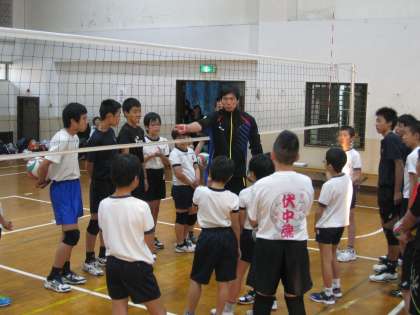 講演会終了後、男女バレーボール部の練習に、福澤選手が加わり、板橋小学校の児童も交えた「バレーボール教室」が開催されました。全日本選手のアドバイスに選手達は真剣に耳を傾け、ますますバレーボールが大好きになったようです。「目標を持って、夢中になれるものを見つけてほしい」という福澤選手の思いを、部員達はしっかりと受け止めたようです。