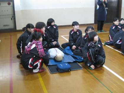 大規模な災害が発生したとの想定の下、伏見板橋幼稚園にかけつけた部員16名が、園児を板橋小学校グランドまで避難誘導を行いました。その後、地域の方々を避難場所である伏見中体育館まで避難誘導し、消防署の職員の指導により心肺蘇生法などの救急訓練を行いました。この訓練を日頃の生活にも活かしていきたいものです。