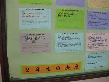 2年生の廊下の掲示板には、図書館で調べ上げた「2年生の決意」が張り出され、新年度のかける心意気が感じられました。賑やかな伏見中学校が動き出しました。