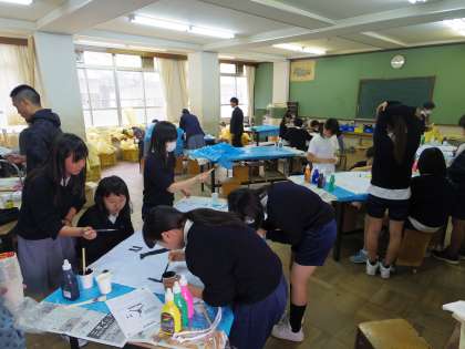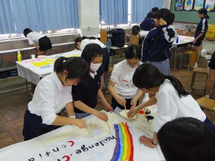 そんな中、クラスの代表生徒が集まり、学級旗の制作をしています。