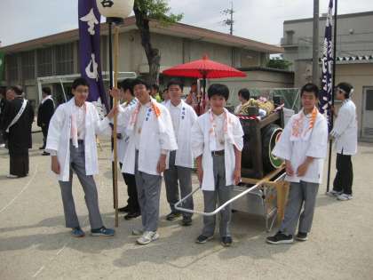 5月14日(日)校区にある金札宮の祭礼に本校卓球部と野球部の部員が参加しました。初夏を思わせるさわやかな日曜日,神輿行列の先導として提灯や太鼓を持ちながら校区内を巡行しました。半被姿の伏中生は、地域の歴史的行事をしっかり体験し、沿道の方々の注目を浴びていました。