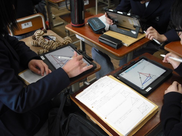 本時の授業では、「平行線と面積」の単元において「等積変形の考え方を理解し、応用できること」を学習目標とし、授業では、前時で学習した内容を思い出しながら、等しい面積をもつ三角形を見つけ出しました。また、応用問題ではロイロノートを活用し、意見交流を通してさまざまな考え方を共有することができました。
