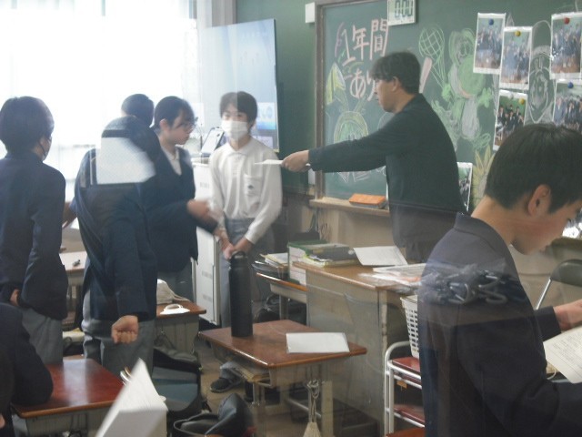 3時間目の学活では、通知表の配布を行うとともに、クラスによっては生徒一人一人が一年間を振り返ってスピーチを行ったり、合唱コンクールの映像を鑑賞したりするなど、短い時間ではありましたが、それぞれのクラスで節目にふさわしい締めくくりの時間となりました。学活の終わりには、名残惜しそうに友達と言葉を交わし、別れを惜しむ生徒の姿も見られました。