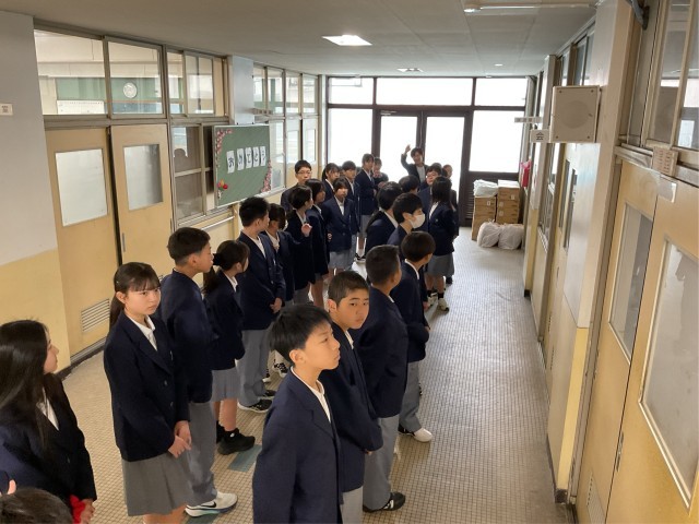 全校生徒が伏見中学校に登校する初日です。あいにくの雨模様でしたが、みなさん元気に登校していました。黒板には先輩からのメッセージが書かれていて歓迎ムード一色です。担任の先生を先頭に校内を散策しました。まだまだどこに何があるのか覚えるのには時間がかかりますが、すこしずつ伏見中学校に慣れてください。