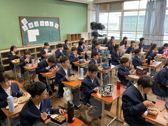 中学校生活で初めての昼食時間でした。まだお互いを知る機会も少なく、静かな中速時間でした。伏見板橋、伏見住吉、下鳥羽の3小学校から集まってきた仲間と、これからどんどん交流を深めていって下さい。