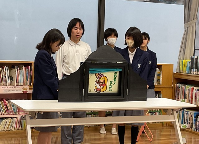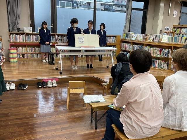 京都市伏見中央図書館にて「子ども読書の日」記念事業に出演させていただきました。部員たちが大型絵本「おふとんかけたら」と紙芝居「ニセモノばんざい」の読み聞かせを行いました。来場者の方々も楽しんでくれた様子で、笑顔がたくさん見られました。