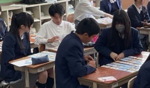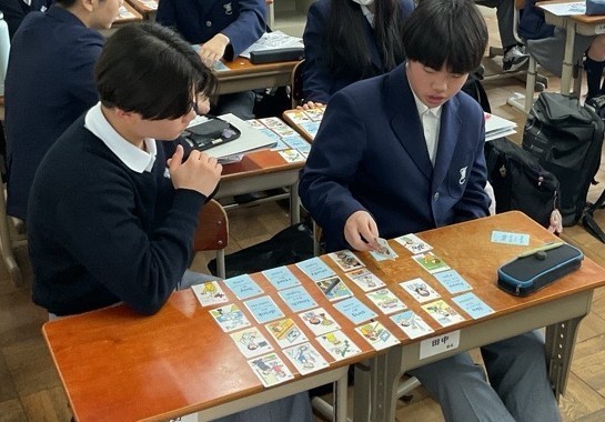 英語の授業では、二人組になってカードを使った短文づくりに取り組みました。動詞が書かれたカードの裏面にはイラストが描かれており、そのイラストを手がかりに英文を考えます。現在形・過去形・進行形など、学習した時制を意識しながら動詞を活用し、できあがった文章を互いに発表し合いました。