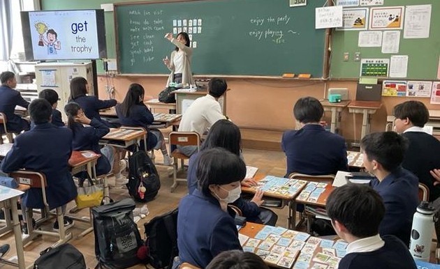 不規則動詞の変化に戸惑ったり、使いたい単語がすぐに思い浮かばなかったりする場面もありましたが、そのたびにペア同士で声を掛け合い、助け合いながら活動を進める姿が見られました。楽しみながら英語表現に触れ、表現する力を高めるとともに、協働的に学ぶ大切さを感じられる授業となりました。